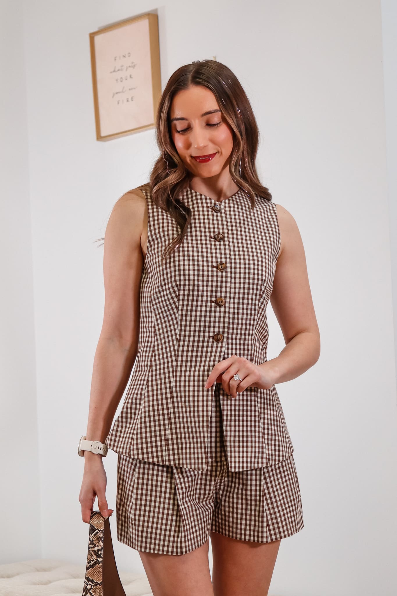 The Emilie Gingham Vest pairs timeless brown and white gingham with a polished button-front silhouette that flatters every frame. Wear it with the matching shorts for a chic look, or wear it solo as a statement piece. The structured fit skims your shape while the classic pattern keeps things effortlessly cute. Perfect for transitional seasons.