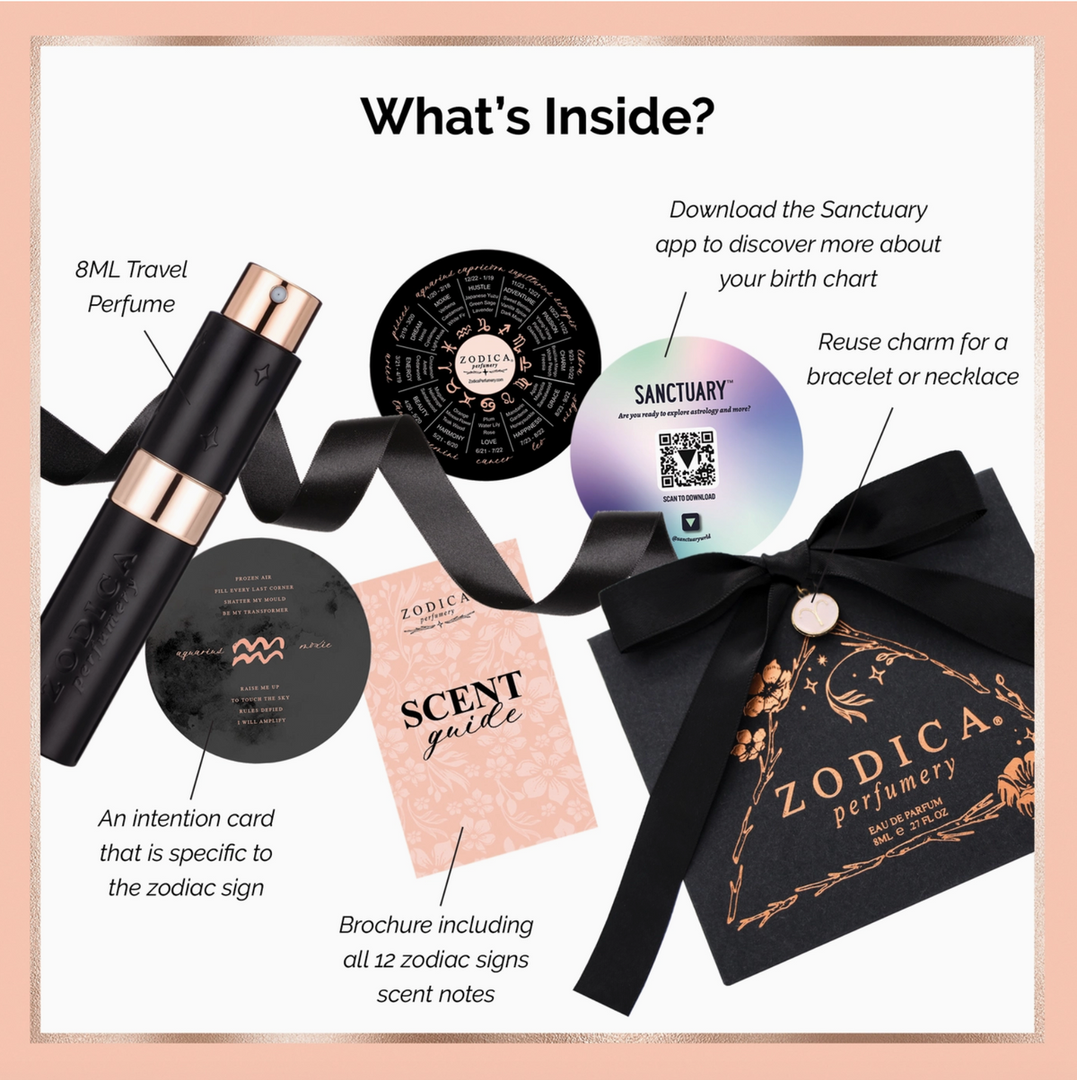 The Travel Spray Twist & Spritz is the perfect gift for all the starlets in your world. The black gift box includes a refillable travel perfume containing 150 sprays, a ribbon and charm with the zodiac symbol and name, and an Intention Card with ScentScope for a magically mindful experience.
