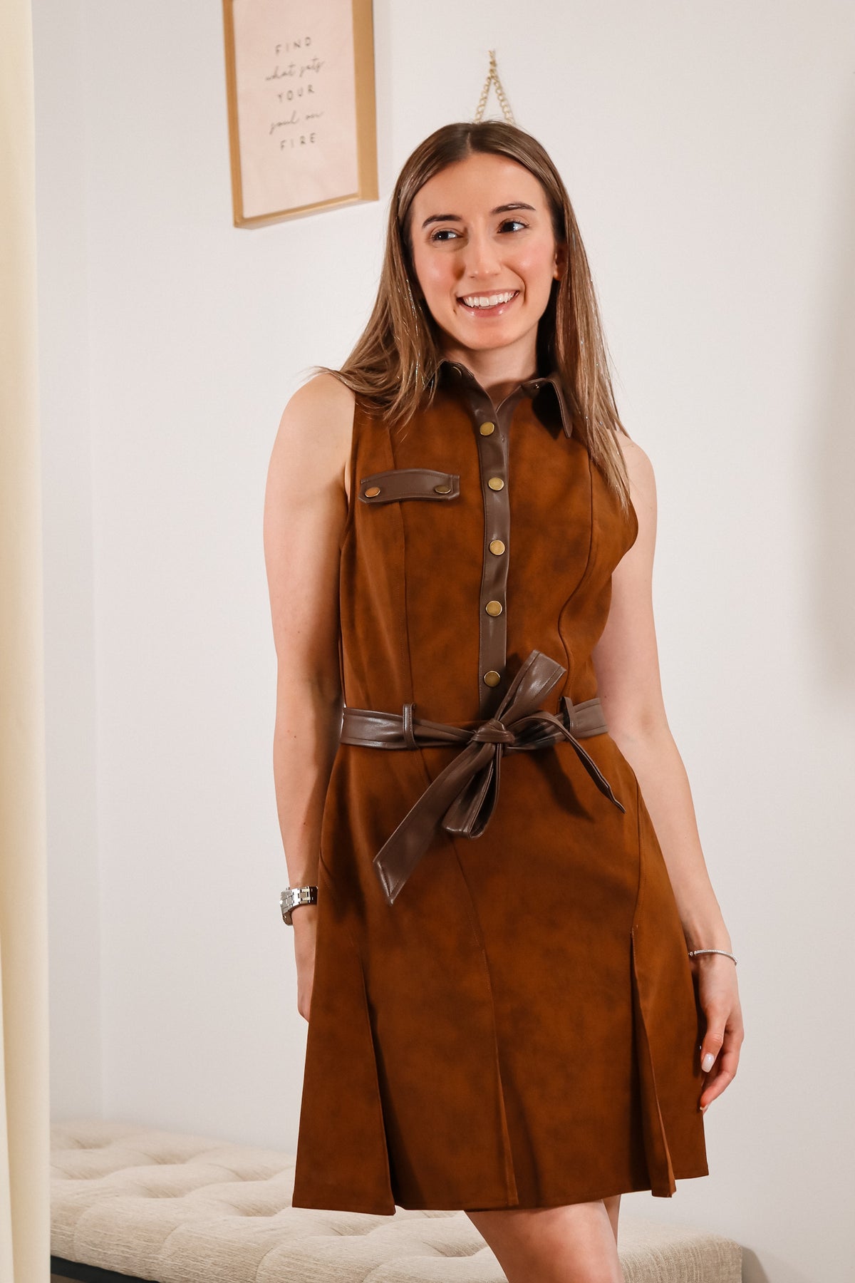 This Eloise Mini Dress is the perfect addition to your fall wardrobe. The mini length, combined with a chic collar neckline and pleated design, create a polished yet comfortable look. With the additional belt, you can cinch your waist for a flattering silhouette. Stay stylish and cozy with this super comfy dress.