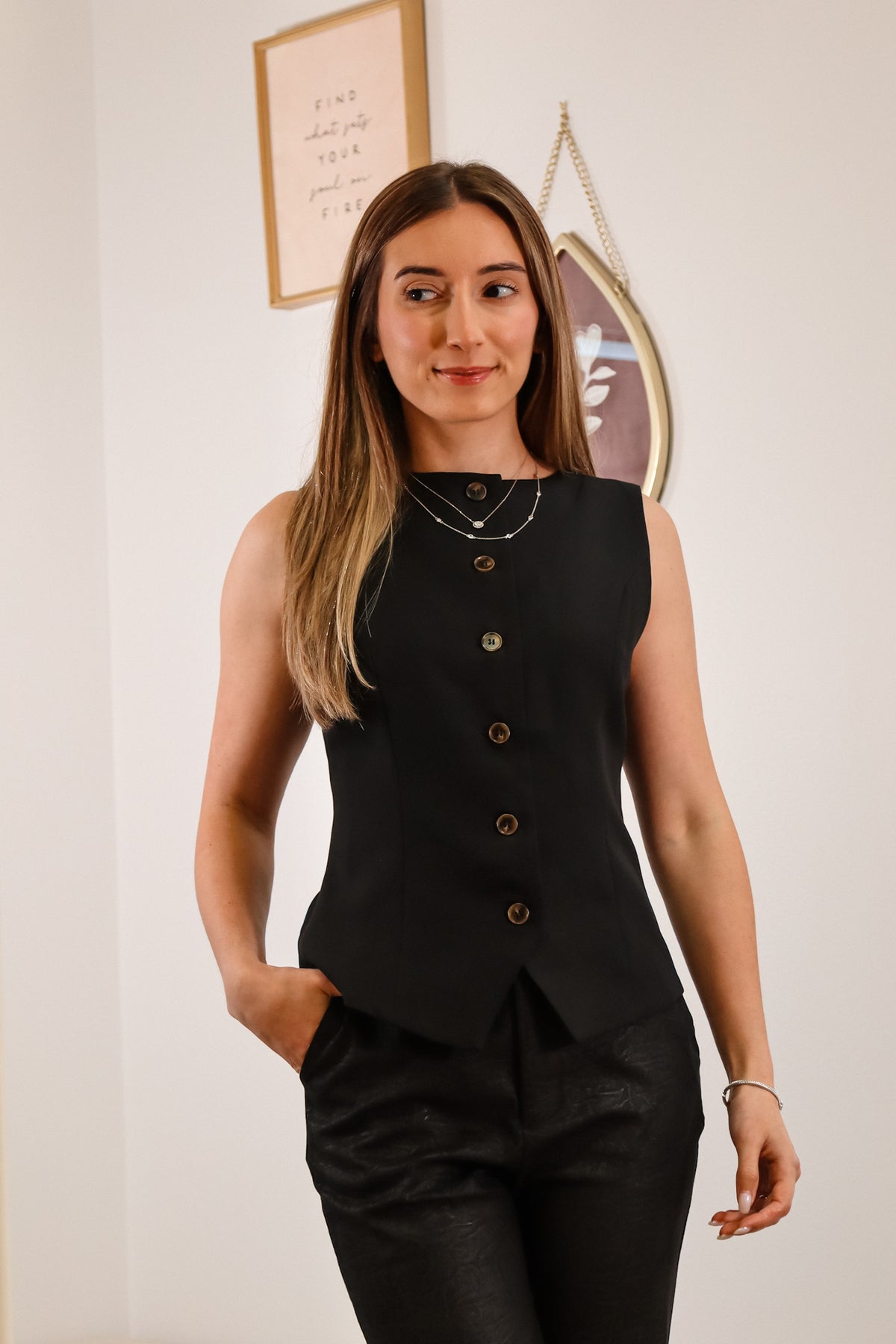 Introducing Roxanne - a black button down vest, the epitome of chic sophistication. Perfect for professional occasions, yet still fun and unique. This versatile piece effortlessly transitions from summer to fall. Upgrade your wardrobe with Roxanne.