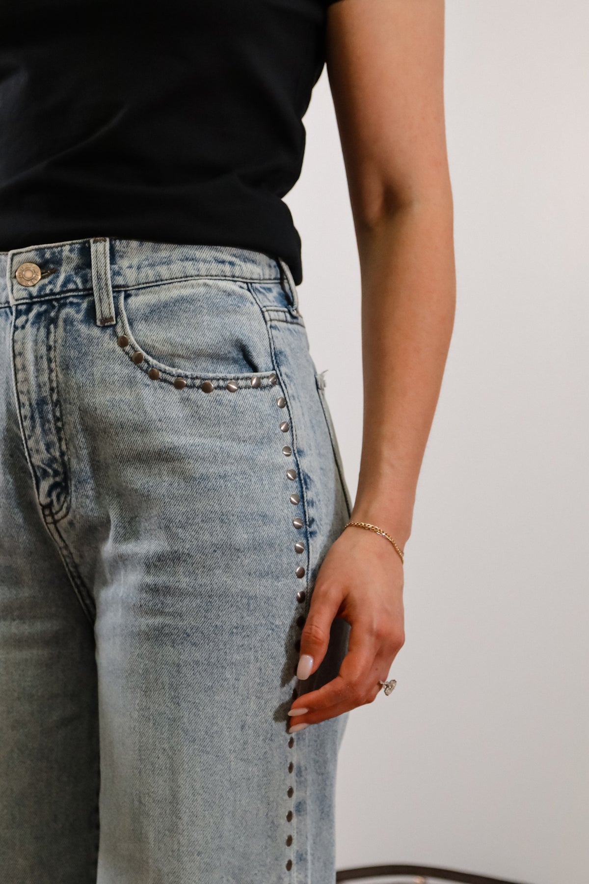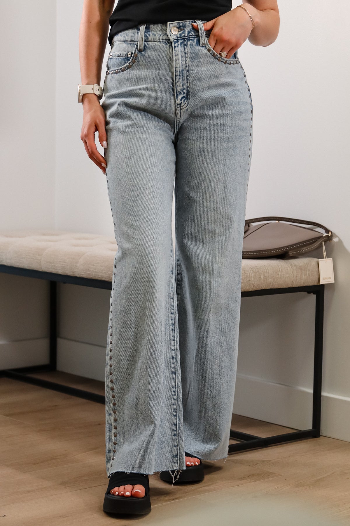 Introducing the Far Out Studded Jeans by Daze - the ultimate combination of style and comfort. With studded accents and a trendy light wash, these mid/high rise jeans can easily be dressed up for any occasion. The wide leg design and super soft fabric make them both cute and comfortable. Upgrade your denim game with DAZE DENIM.