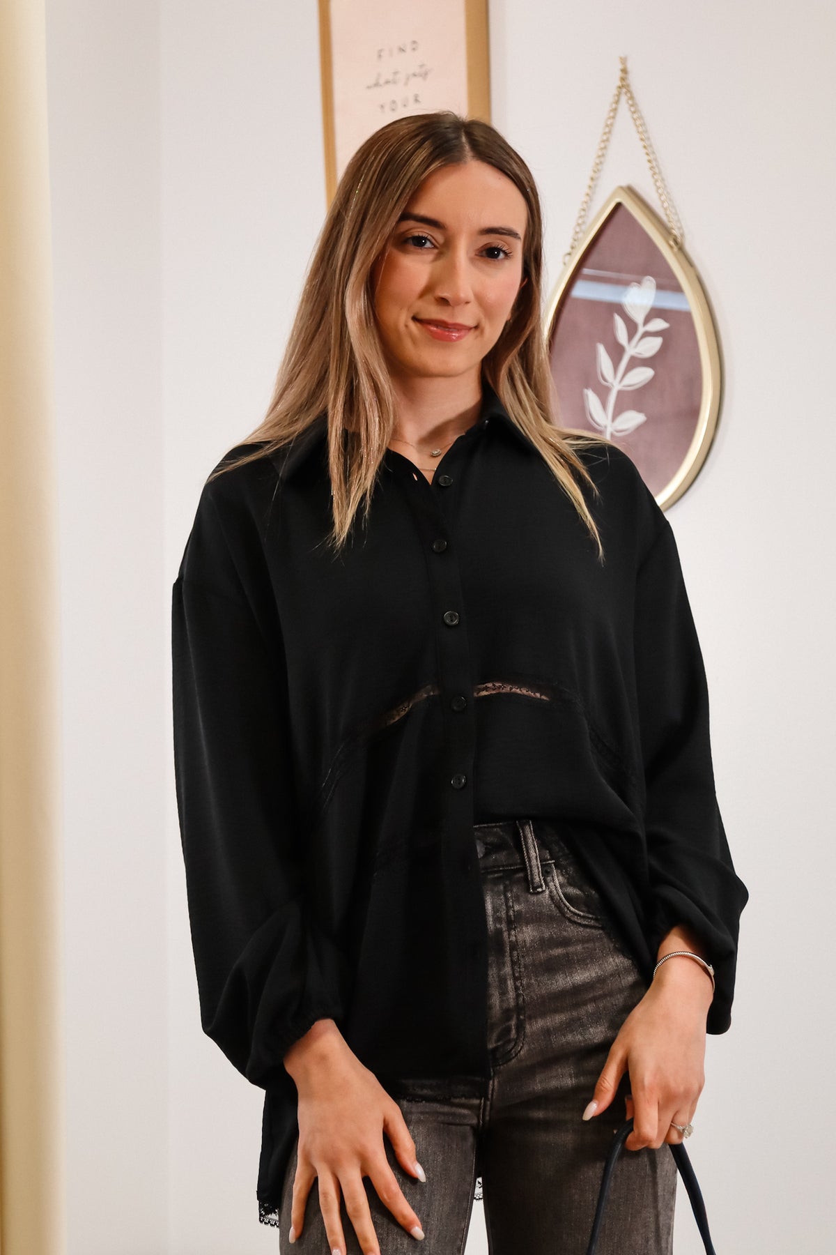 Looking for your new go-to top? Introducing the sophisticated Georgia - Long Sleeve Button Down. Elevate your wardrobe with this black button up top featuring a unique scrunched sleeve and delicate lace trim. Add a touch of class and chic to any outfit with this truly one-of-a-kind piece.