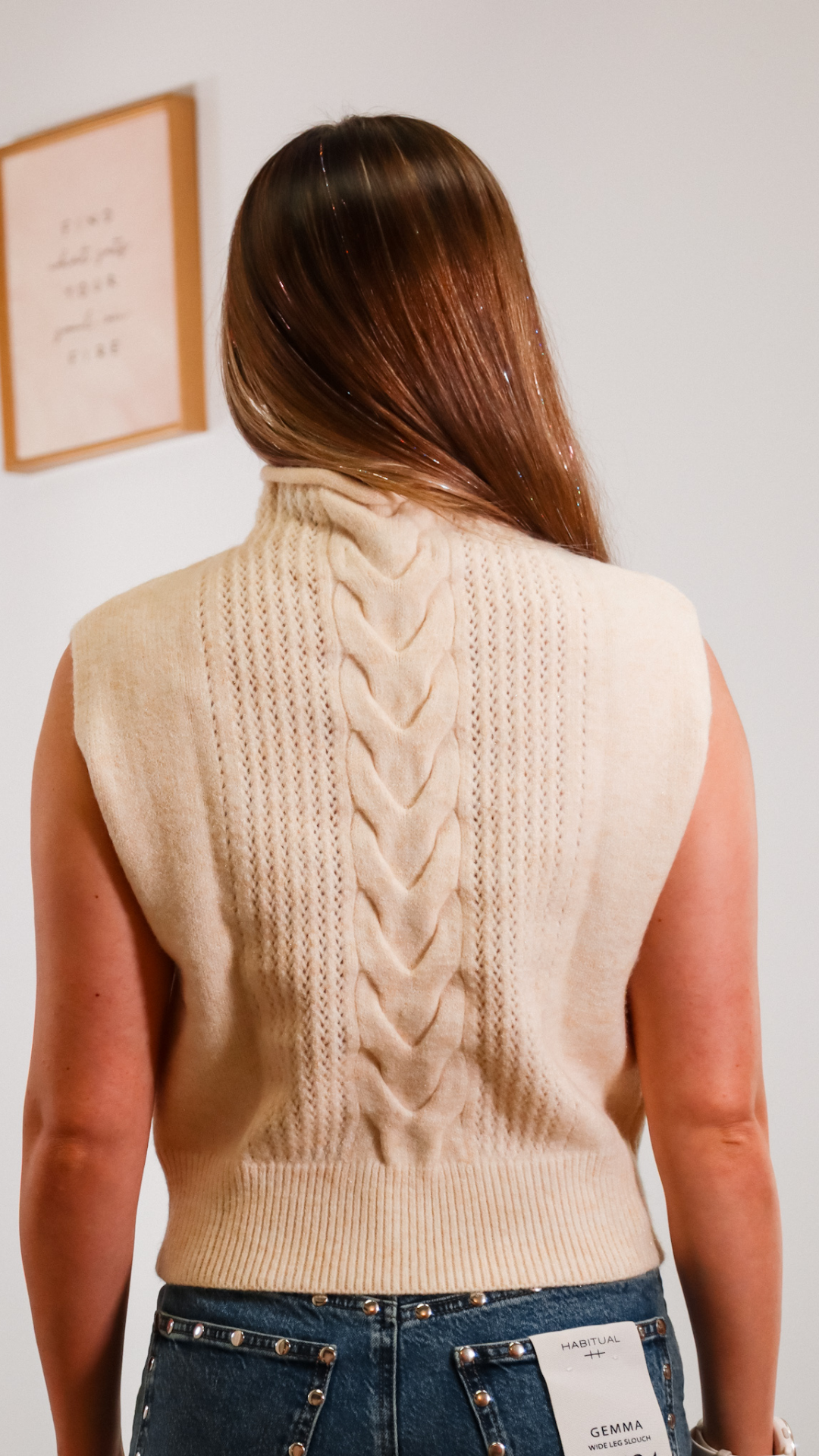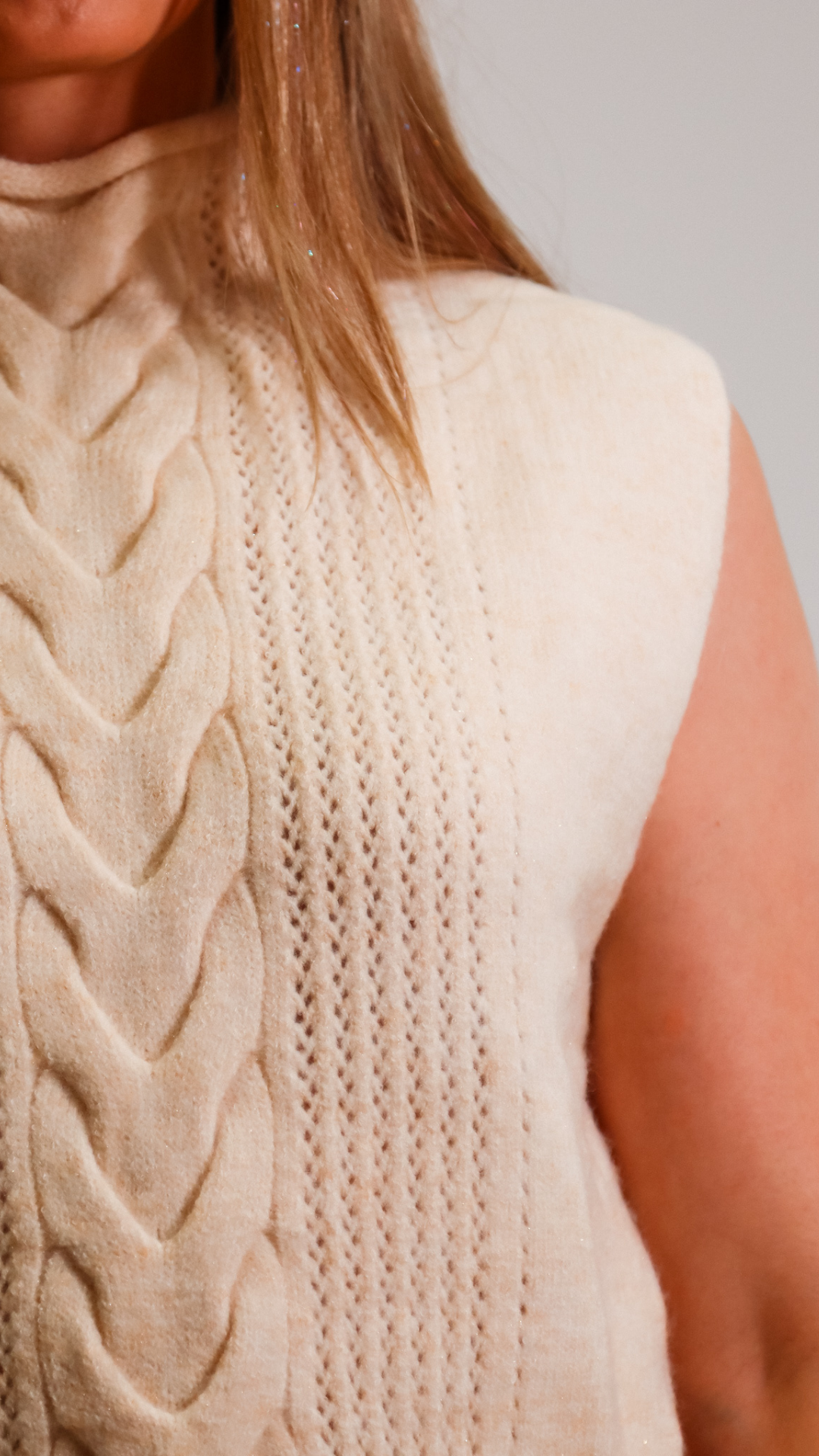 This sleeveless white sweater from En Saison, Stenson, features an elegant cable knit pattern, offering a refined look perfect for layering or wearing on its own. Its clean design adds a touch of sophistication to any outfit, making it a versatile addition to your wardrobe.
