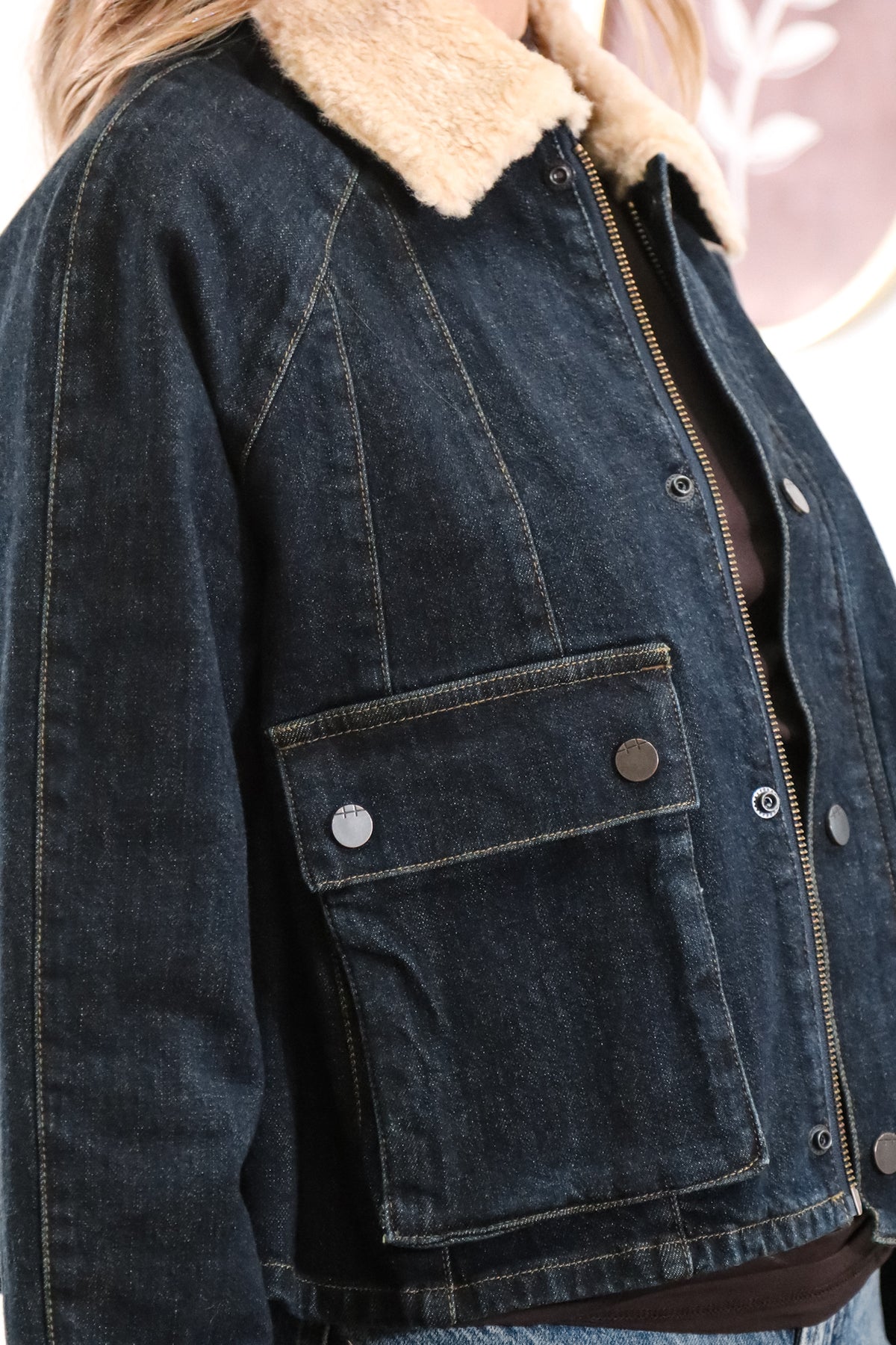 The barn jacket style is extremely on trend this season! Stay cozy and stylish with this Cropped Barn Jacket featuring a fluffy sherpa collar that adds a touch of warmth and charm. Crafted from durable denim, this piece is designed with classic buttons & zipper, as well as handy pockets, offering a playful yet practical look. Perfect for layering on chilly days, this jacket brings a fun, fresh twist to your casual wardrobe.