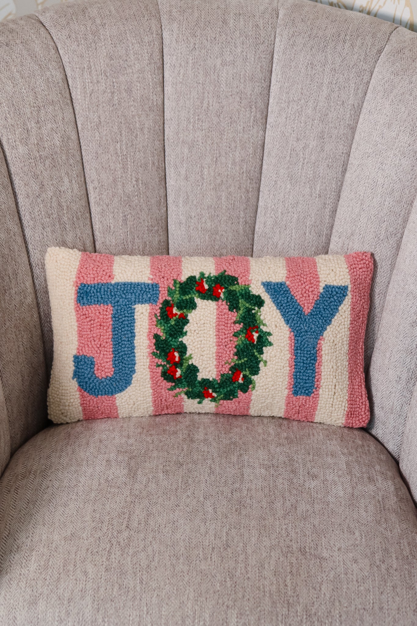 In need of a cute holiday pillow? We have just this thing. Our new embroidered Pink Stripe Joy pillow is not only cute but very festive for the holidays. Hosting this season? This pillow adds the perfect amount of style and comfort into your home and elevates any room. This pillow also has a zipper, allowing you to wash it.