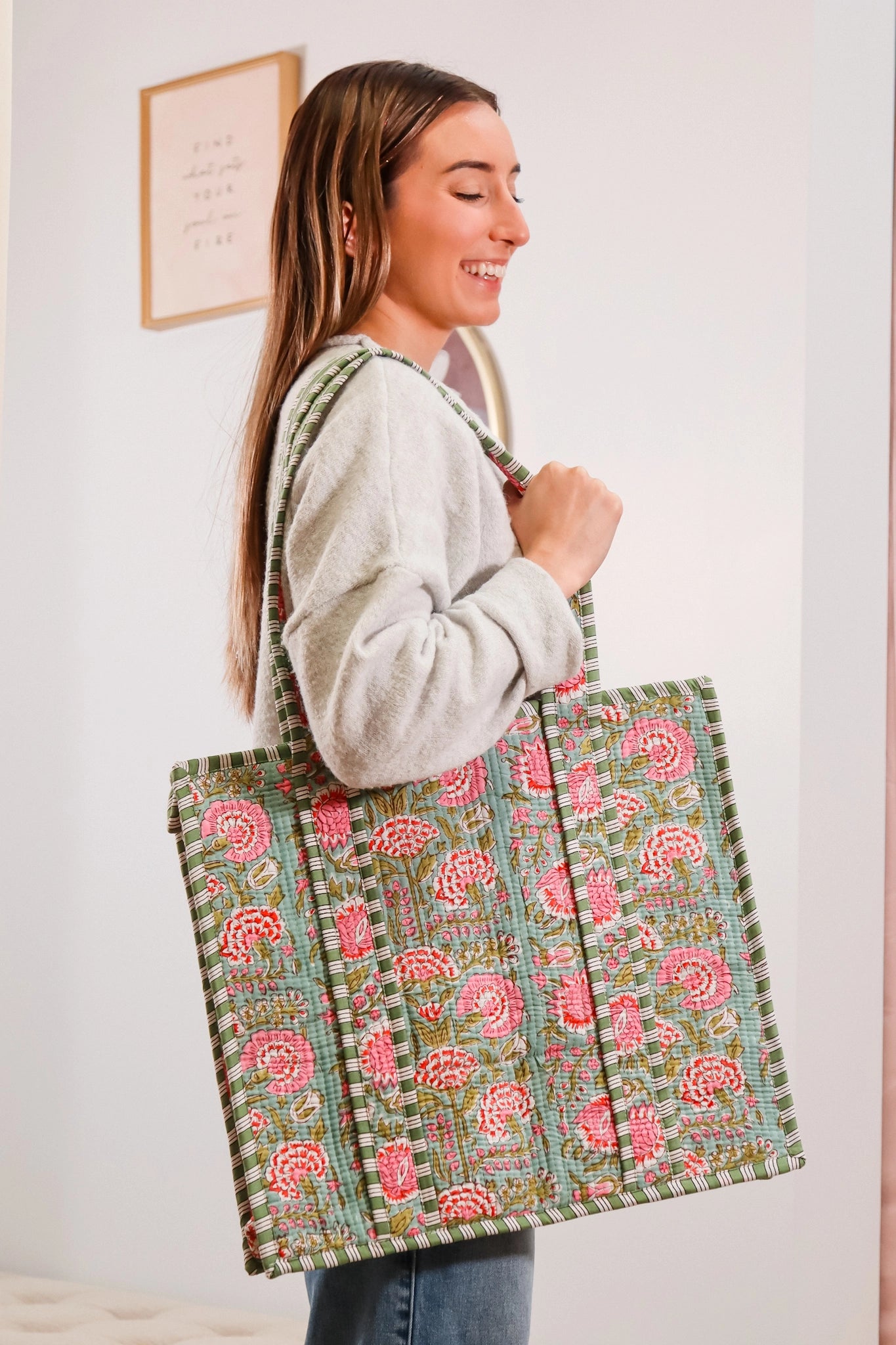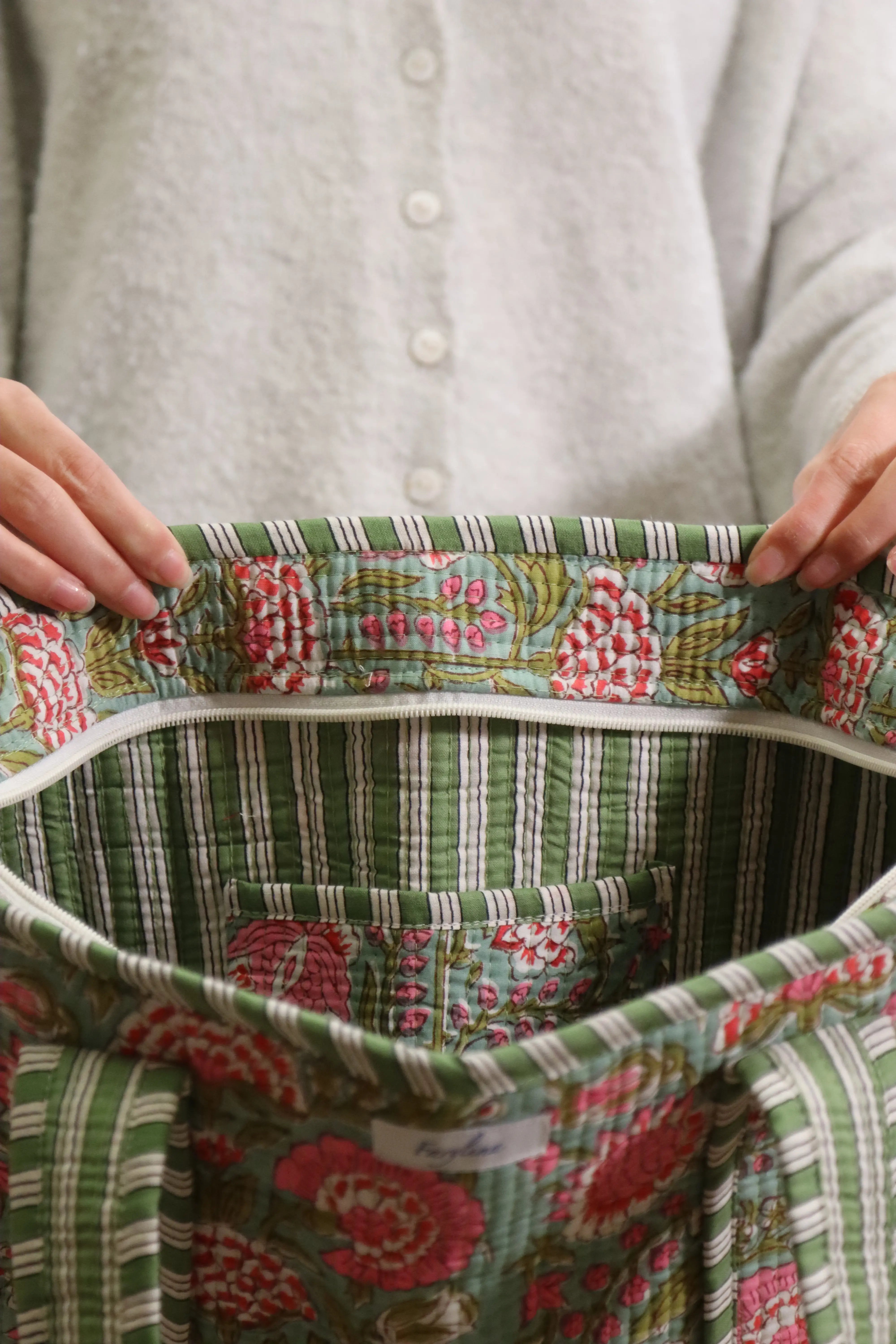 Ladies, we present to you the ultimate Pintrest-inspired quilted tote bag! With a top zipper closure, full interior lining with a pocket for your phone, and two comfy top handles, the Got it in the Bag tote bag is a must-have! Available in many different prints, pick out the one that best suits your style and personality! All prints are created and done by hand!