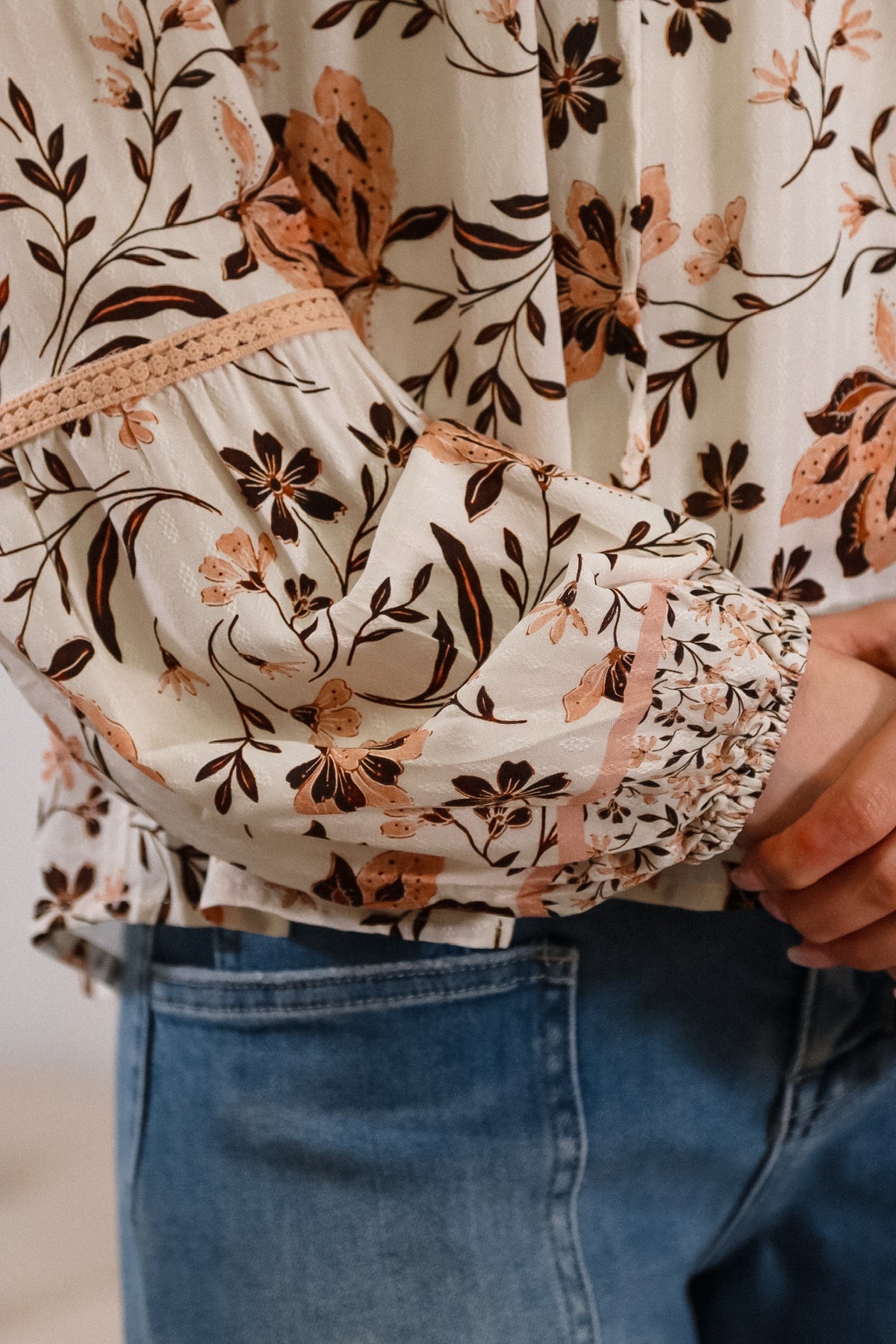 This Viola Lace Trim - Peasant Blouse features a beautiful floral design, a trendy v-neck, and stylish ties on the neckline. Its hip length and comfortable fit make it perfect for pairing with white jeans for a chic look. Add this versatile top to your wardrobe for effortless style.