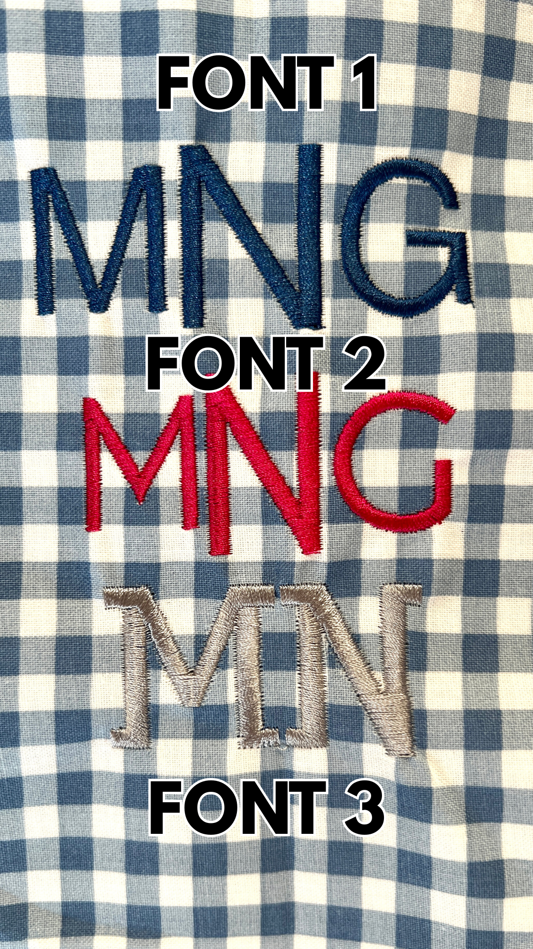 We will stitch out your monogram in the order that you type in. For example, if you type MNG, we will stitch from left to right, M, and then the N will be in the middle and larger, and then the G at the end will be the same size as the M.