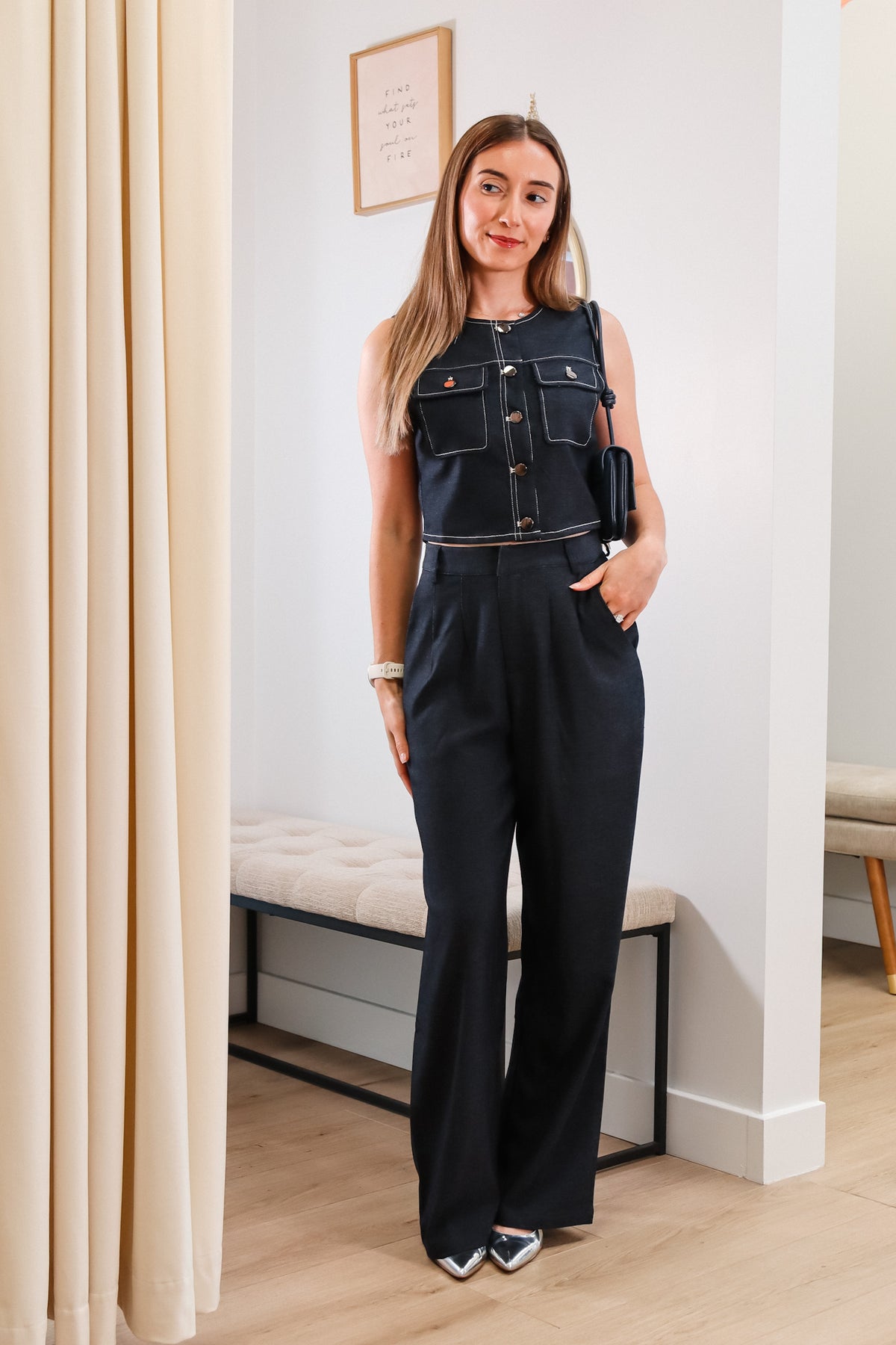 In need of the perfect mid-length vest? Add a dash of fun to your wardrobe with this denim vest top featuring shiny silver buttons and a slightly cropped cut. Perfect for layering or wearing solo, it brings a playful edge to any outfit while keeping things cool and casual. Pair it with the Troubleshooter Trousers to create a matching set!